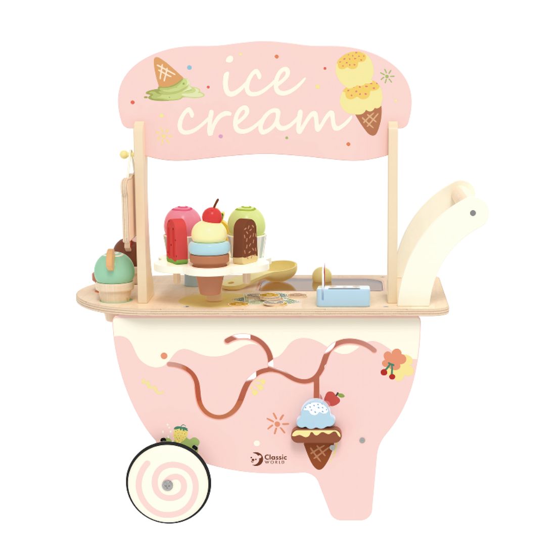 - O Carrinho de Sorvete Gelateria Infantil Brinquedo Classic World é projetado em Paris e fabricado em madeira natural, garantindo qualidade, charme e durabilidade.