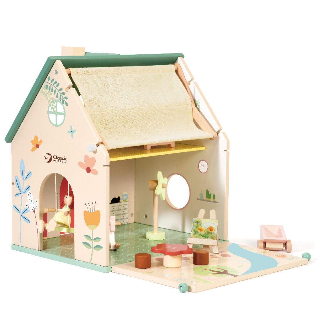 A Casinha das Flores Campo Exclusive Madeira Classic World inclui diversos acessórios que enriquecem a brincadeira criativa: balanço, cavalinho de madeira, carrinho de jardim, cavalete de arte e muito mais. As crianças podem levar a boneca para balançar, pintar, passear e viver muitas aventuras ao ar livre — tudo dentro da própria casinha.