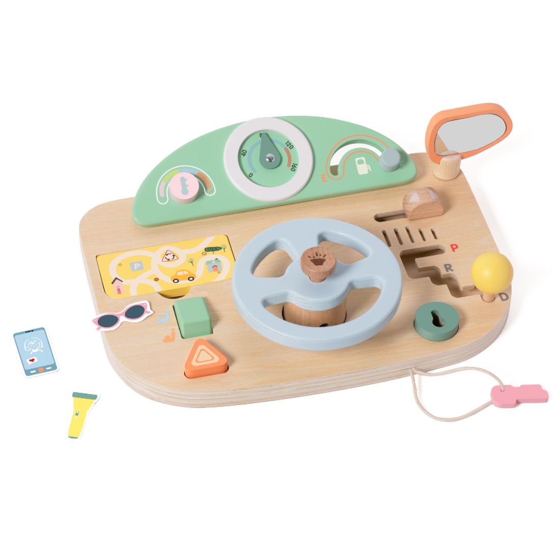 Cockpit Interativo Volante Multifuncional Brinquedo Madeira Classic World, ou Multi-Function Steering Wheel em seu nome original, permitem as crianças simularem a experiência real de dirigir, assim como a mamãe e o papai.
